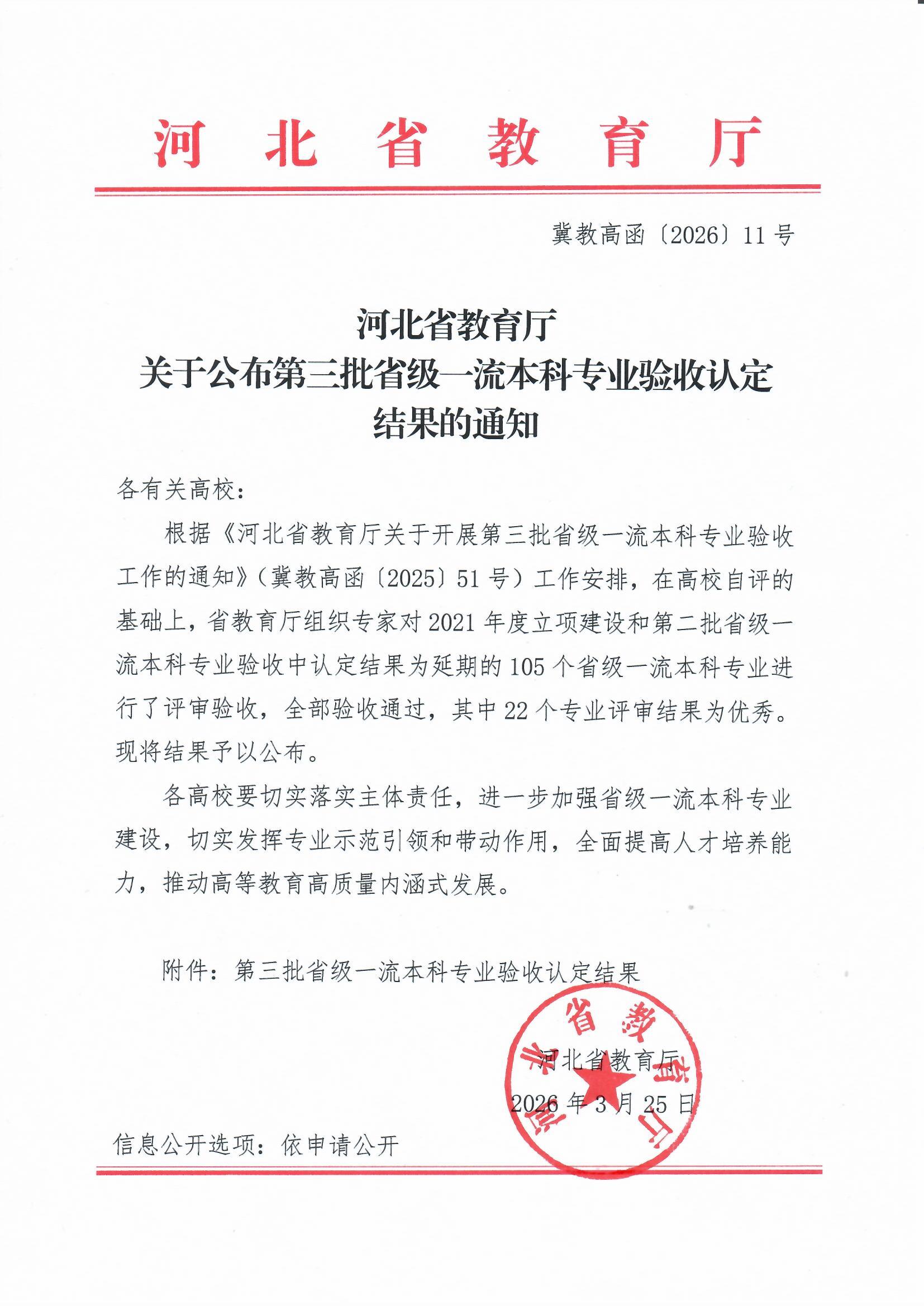近日,河北省教育厅印发《关于公布第三批省级一流本科专业验收认定结果的通知》(冀教高函〔2026〕11号),我校英语专业顺利通过验收,被正式认定为省级一流本科专业。截至目前,学校累计已有10个专业通过省级一流本科专业验收,专业建设成果显著。